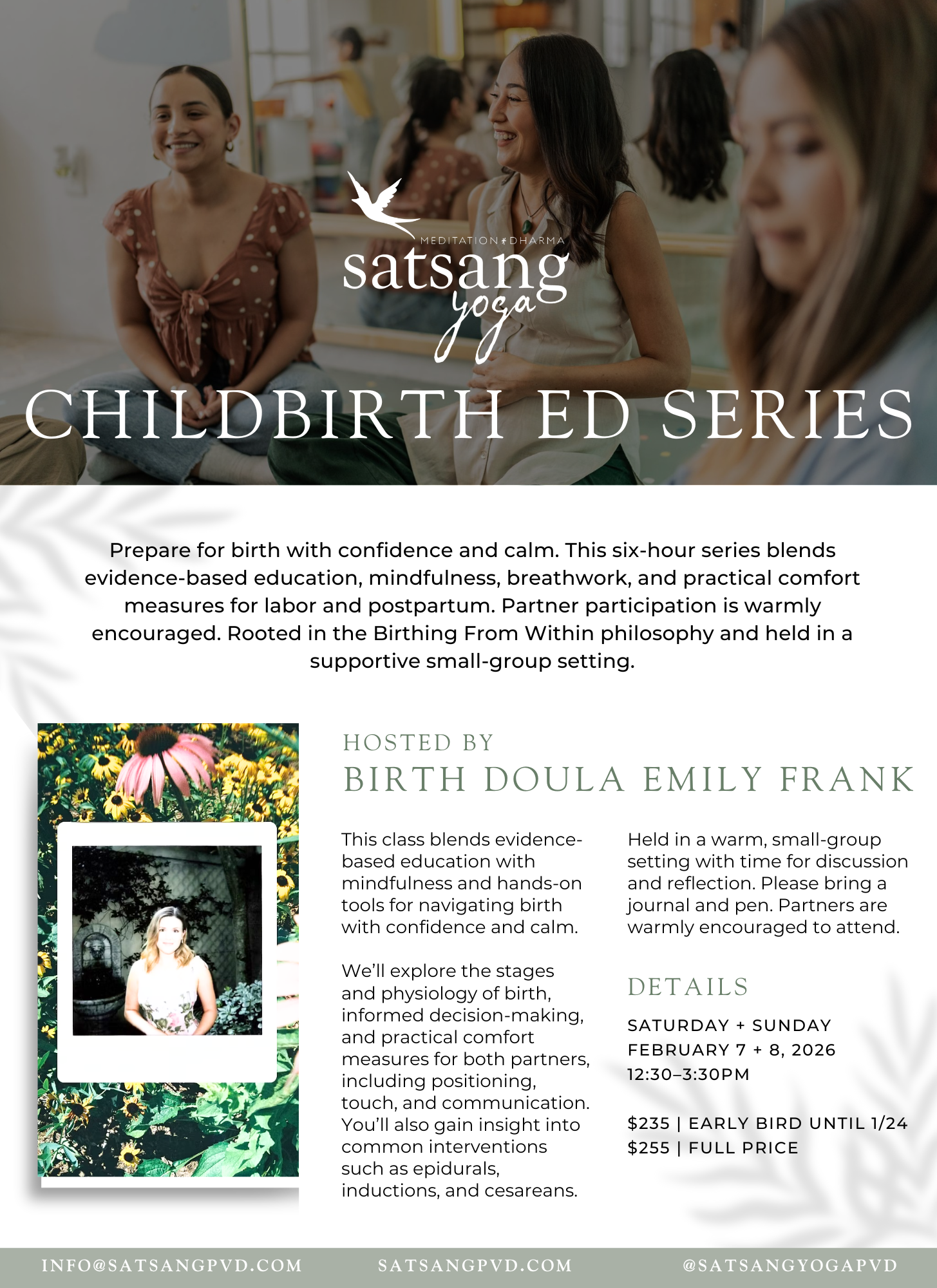 Back to All Events Childbirth Ed Series w/ Birth Doula Emily Frank Saturday, February 7, 2026 12:30 PM Sunday, February 8, 2026 3:30 PM Satsang - yoga, meditation, dharma 999 Main Street Pawtucket, RI, 02860 United States (map) Google Calendar ICS REGISTER HERE